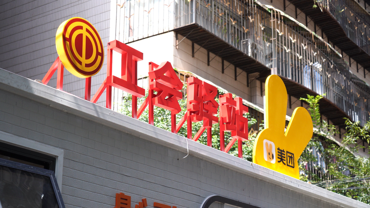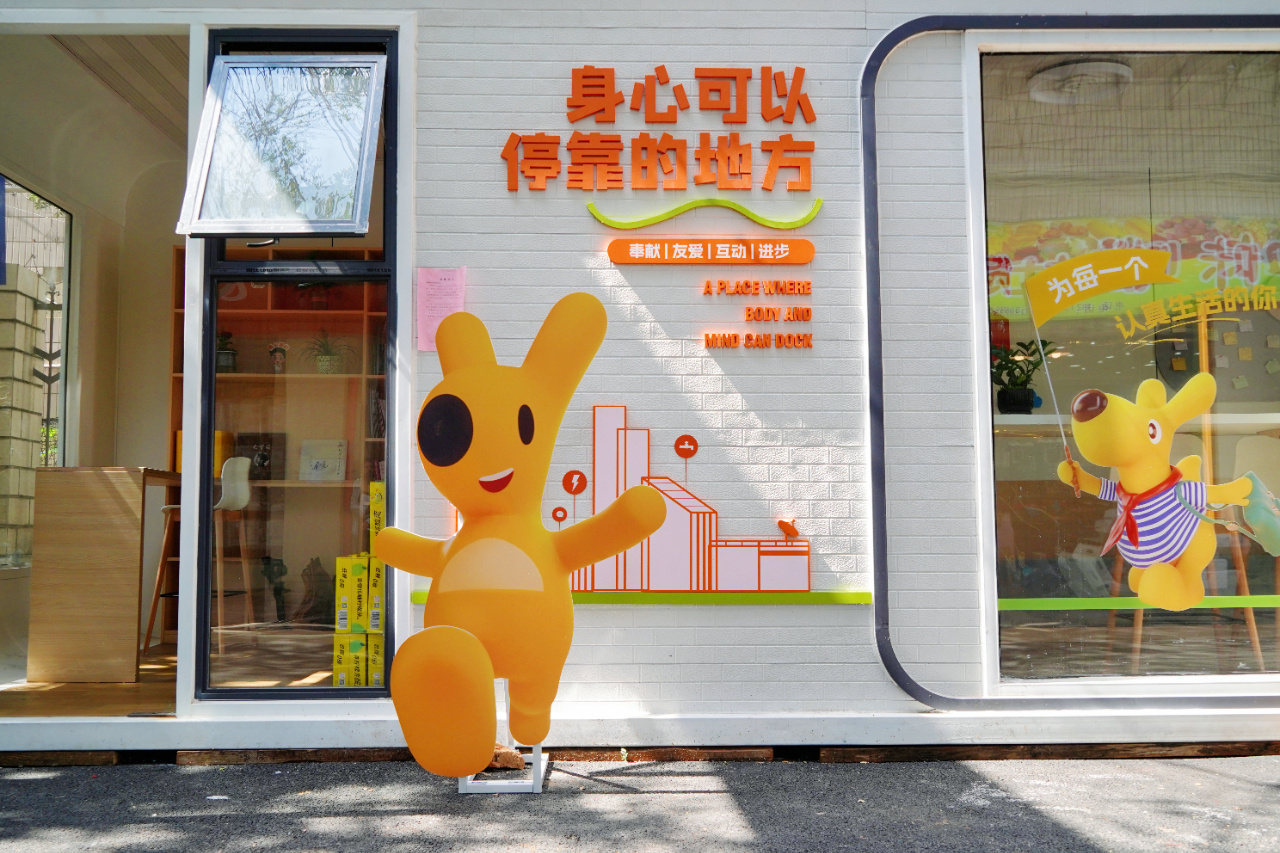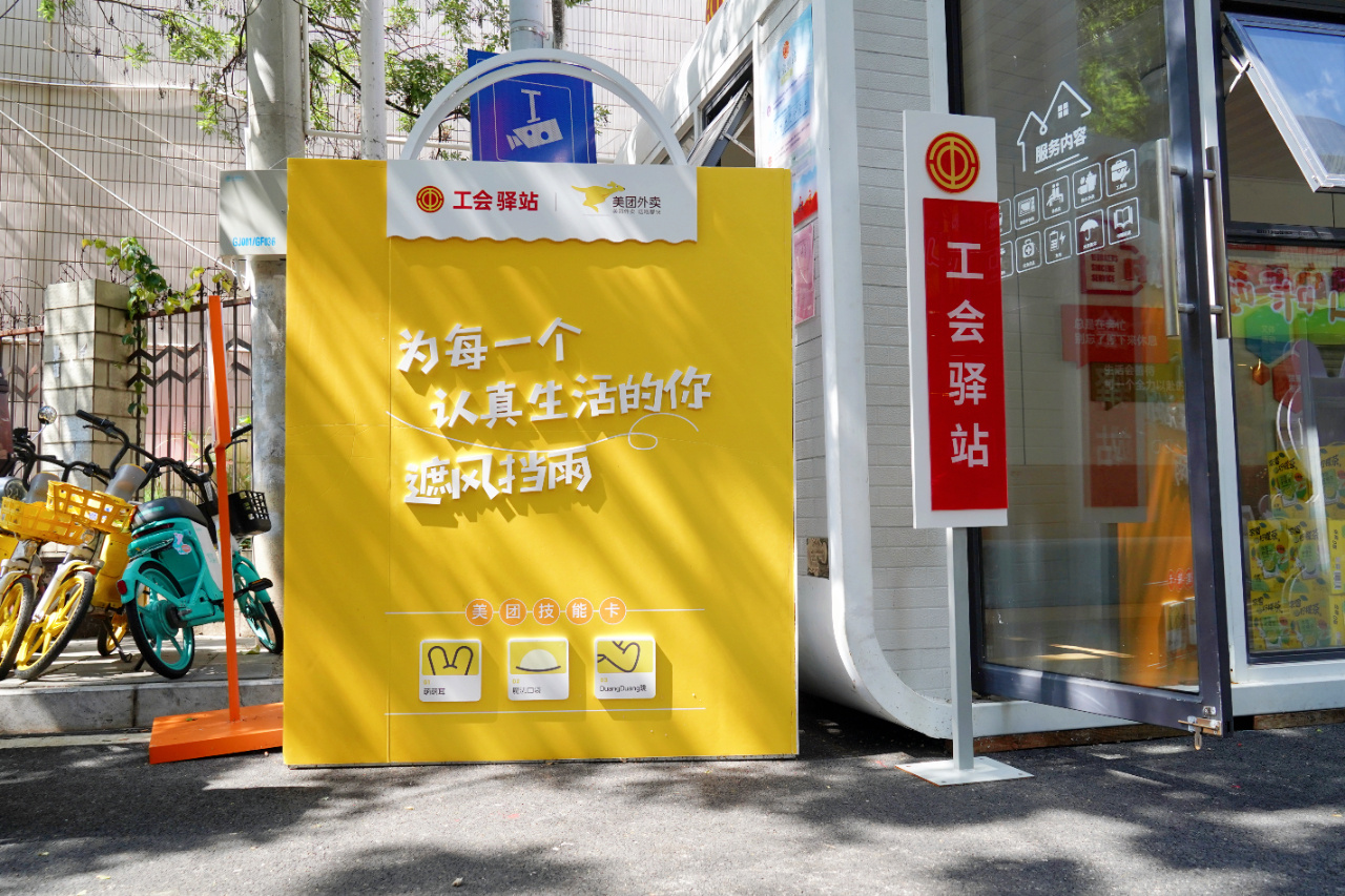 走进富春街工会驿站,记者看到,首先映入眼帘的就是大大的“工会驿站+美团‘袋鼠耳朵’”标识,整体以黄红配色为主,打造了城市剪影、美团骑手卡通形象、美团技能卡墙等,配以“为每一个认真生活的你遮风挡雨、身心可以停靠的地方……”等温暖标语,吸引眼球的同时又透露出温馨。