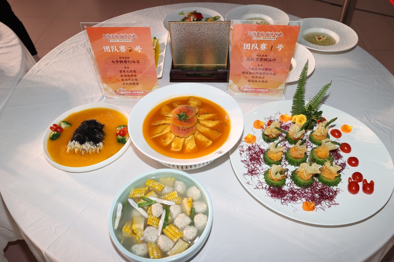 竞赛分为专业组(团队赛)和业余组(个人赛),均以现场实操形式展开。专业组需在60分钟内完成“三菜一汤”,包含一道豆腐精品菜、一道创意融合菜、一道地方特色菜和一道实用家常菜;业余组则需在规定时间内完成一道豆腐主题拿手菜品,所有参赛作品均围绕“营养、健康、养生、百味”主题创作。